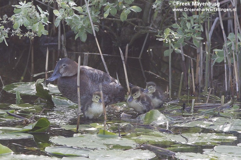 Vrouwtje tafeleend met zes kuikens in de polder Stein Noord. Foto: 3 juni 2013.