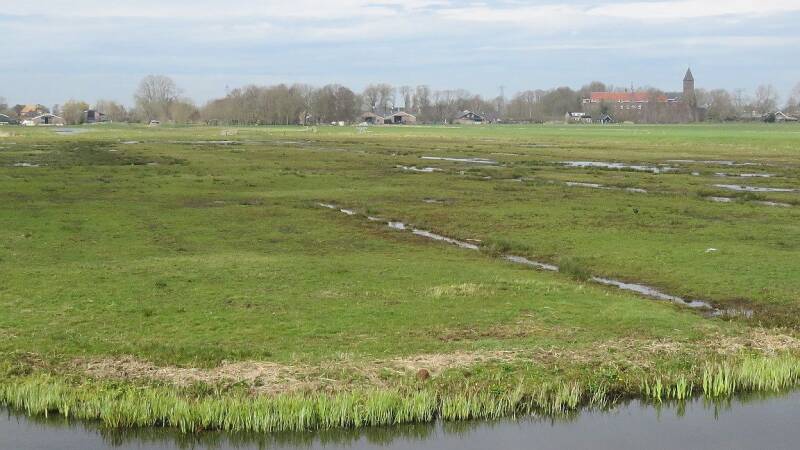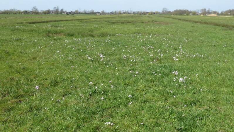 Overzicht van een deel van het weidevogelblok aan de noordkant. Verspreid liggende plasdras stukjes wisselen af met iets hoger en droger gelegen stukjes. Zeer geschikte broedplaatsen voor de weidevogels en eendachtigen.