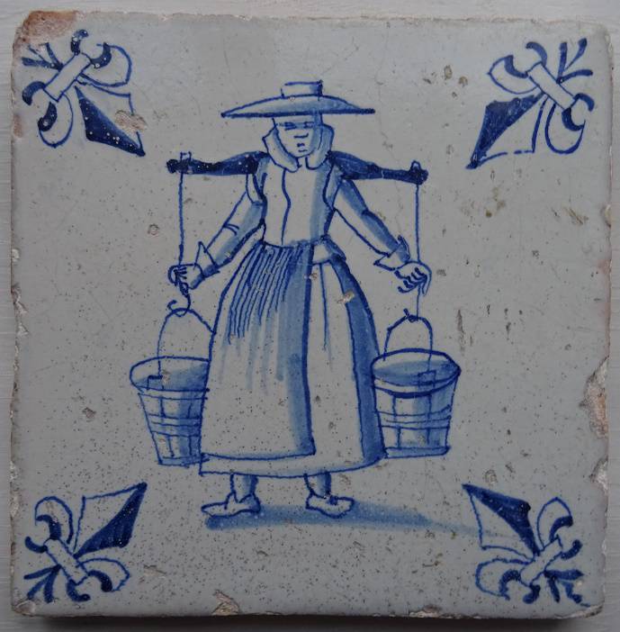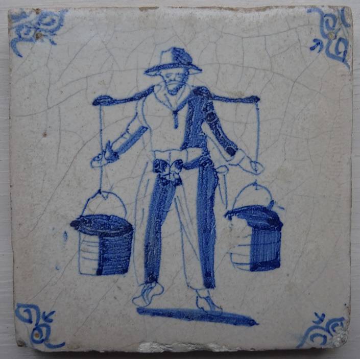 Op de twee antieke tegels staan figuren afgebeeld met een juk met emmers. De tegels dateren uit het midden