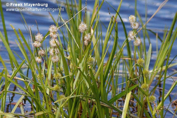 In de heldere sloten groeien veel water- en moerasplanten. Op de foto links staan twee soorten waterplanten vlak naast elkaar. Links de grote egelskop en rechts de kleine egelskop. De kleine egelskop is onvertakt zoals op de rechterfoto is te zien.