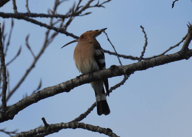 Op het vakantiepark in Cabanas werden we toen het weer beter was vrijwel elke ochtend gewekt door roepende hoppen. Baltsgedrag van een paartje. Foto's kunnen maken van het paartje in een boom zonder blad. Afstand was wel groot; zo'n 150 meter. Voor de 3000mm lens echter geen probleem.