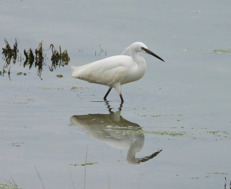 Lepelaar en kleine zilverreiger in een plasje langs de pier bij Santo Antonio.