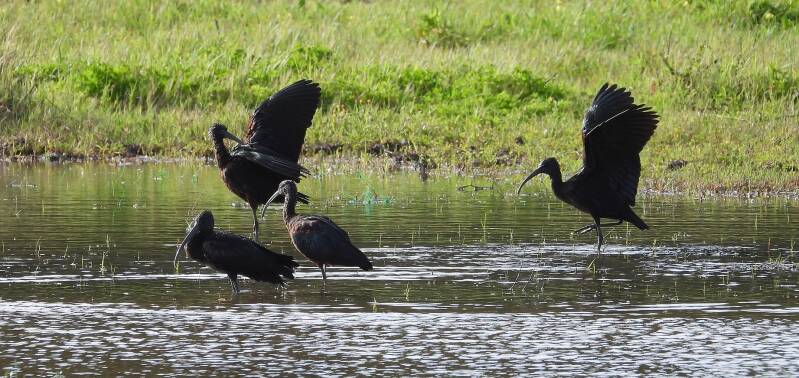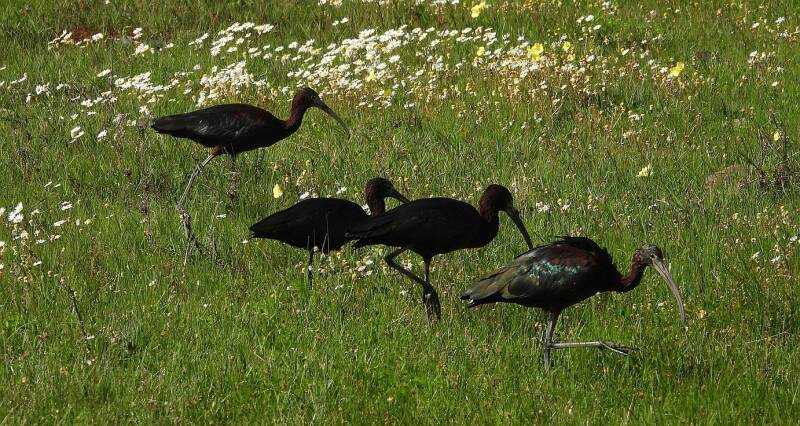 Een flinke groep van zo'n 50 zwarte ibissen zocht voedsel op een stukje weiland (tussen de koereigers) bij Cabana.
