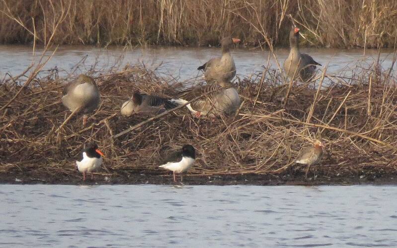 3 Februari 2025. Een prachtige zonovergoten dag; lichte vorst in de nacht en overdag de temperatuur ruim boven de 0 graden. De plas van natuurgebied de Hooge Boezem lag er deels open/deels bevroren bij. Flinke aantallen eendachtigen op het ijs zittend en aan de randen zwemmend. Geteld werden o.a. 33 bergeenden, 65 wintertalingen, 90 slobeenden, 4 pijlstaarten en 1 ijsvogel. De eerste 2 scholeksters waren ook al weer teruggekeerd om in een van de aangrenzende polders te gaan broeden. Ook een flink aantal grauwe ganzen aanwezig waarvan diverse exemplaren met hun gedrag verraadden dat de eerste paren al begonnen zijn met eileg.