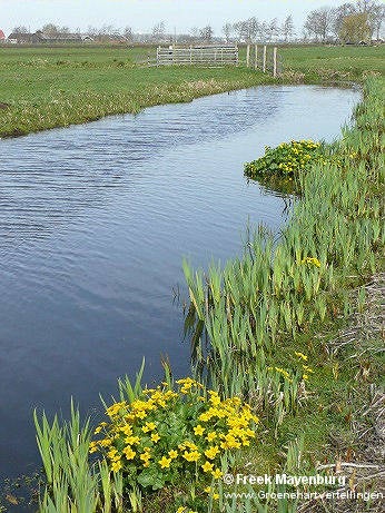 Dotterbloemen in de polder Oukoop in slootkant bij een veenput tezamen met gele lis. Foto's: 16 april 2018