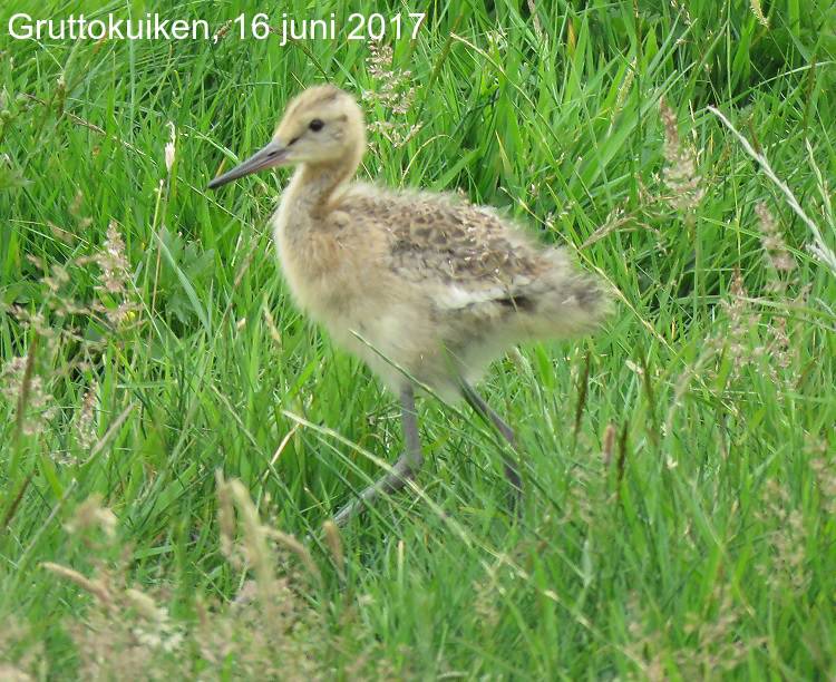 6 juli 2017. Situatie weer anders. Twee vliegvlugge kuikens liepen in een vochtige laagte van een perceel grasland tussen de vegetatie (die voornamelijk uit waterpeper en mannagras bestond) voedsel te zoeken. Op het grasland perceel ernaast liepen ook twee vliegvlugge kuikens met in de buurt de wakende en alarmerende ouders. Deze kuikens vlogen over de sloot om bij de andere twee kuikens op insectenjacht te gaan. Vier vliegvlugge kuikens. Die moesten wel van twee gruttopaar zijn terwijl er maar een ouderpaar aanwezig was. Dan kon het niet anders of een ouderpaar had de vliegvlugge kuikens al in de steek gelaten. Het is bekend bij vliegvlugge gruttokuikens dat ze tijdelijk zonder ouders in groepjes rondzwerven om in de loop van juli op verzamelplaatsen te verschijnen, al dan niet begeleid door enkele oudervogels. Dit heb ik in voorgaande jaren geconstateerd door op gruttoverzamelplaatsen veel avondtellingen te doen en vast te leggen wanneer precies de vliegvlugge kuikens daar beginnen te verschijnen.