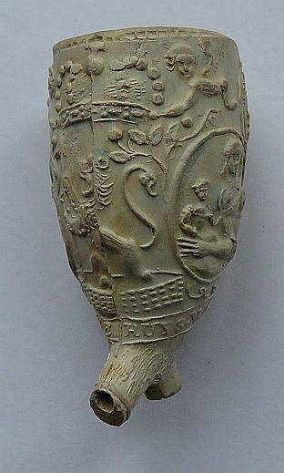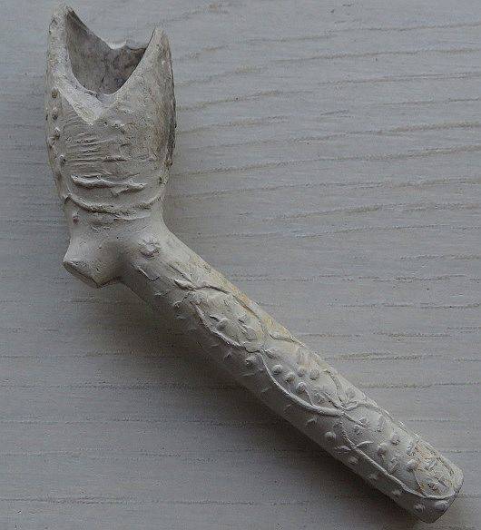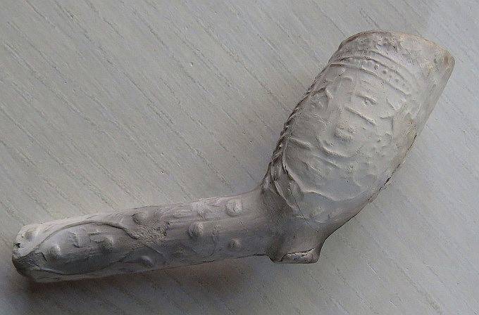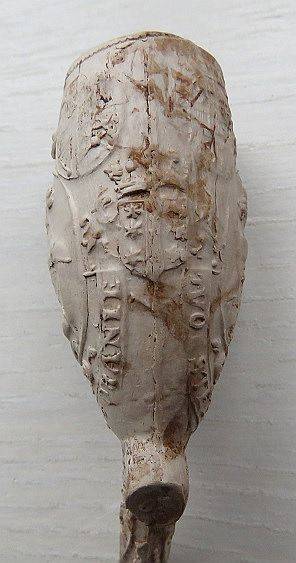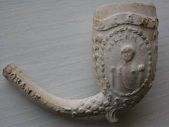 Op de steel van deze hoornpijp staat een deel van een tekst.