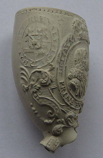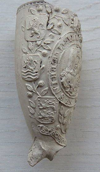 18e eeuwse ORANJE kleipijp (ds33 FM 1585). Dezelfde mal als pijp hierboven. Met portretten van Oranjevorsten en wapens. Hielmerk is afgebroken. Vindplaats: niet bekend.
