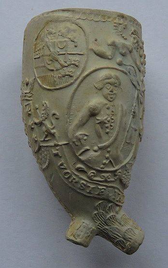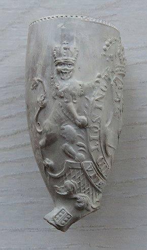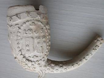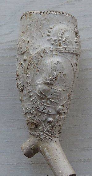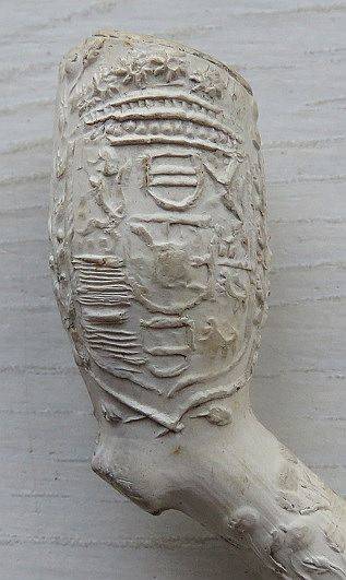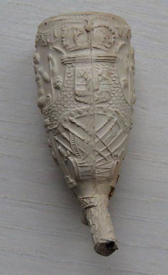 Kleipijp (FM) van ca. 1670 met aan twee kanten de voorstelling van Stadhouderlijke wapens. Fraai bewerkte steel.