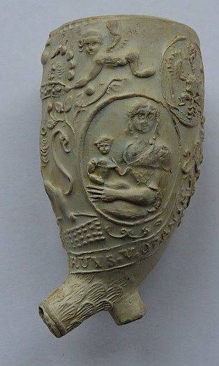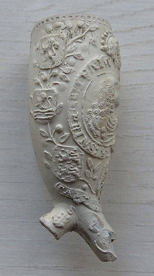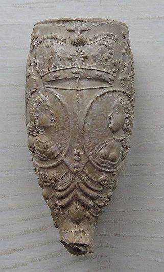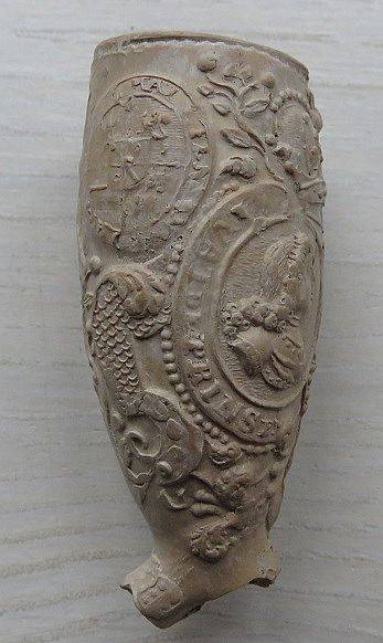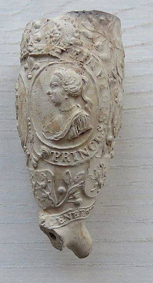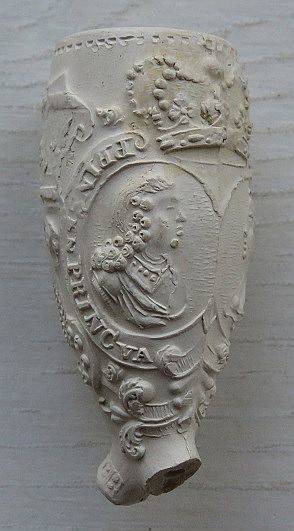 Kleipijp ORANJEpijpjes (part. verz) met de voorstelling van portretten van Amalia van Solms (links) en Frederik Hendrik( rechts). Kleipijpjes zijn waarschijnlijk uitgebracht bij hun huwelijk. Omstreeks 1625. Bodemvondsten Reeuwijk in een pijpenstort van barokpijpjes.
