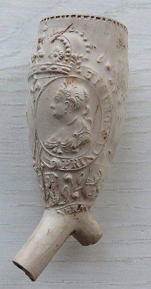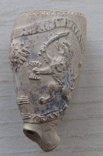 18e eeuwse ORANJE kleipijp met aan twee kanten een Prins te paard en de tekst: VIVAT ORANIE. Met een stukje bewerkte steel. Vindplaats omgeving Gouda.