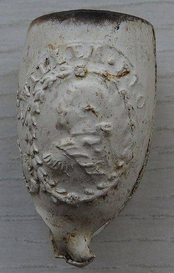 Afbeelding van een leeuw met zijn poot op een wereldbol, in dit geval een kijkglaasje. De pijp symboliseert de zege van Oranje uit de tijd van de slag bij Waterloo. Vermoedelijke maker P. van der Want. Bodemvondst Achterwillens Gouda