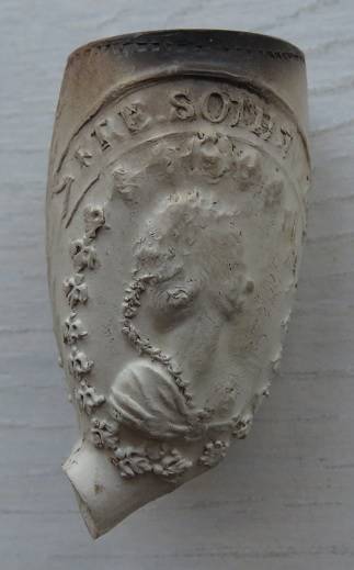 Rechterfoto's: Hoornpijp met aan de ene kant de afbeelding van Koning Willem III en aan de andere zijde zijn vrouw Sofie, prinses van Württemberg. Op het kleine stukje steel is de tekst nog te zien met de namen SOPHIA en WILLEM. De maker van deze pijp is niet bekend. Bodemvondst: Achterwillens Gouda