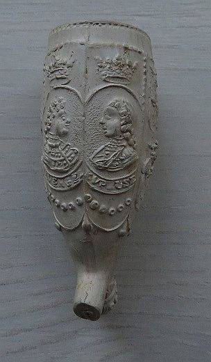 18e eeuwse ORANJE kleipijp (ds33 FM 1040) met medaillons met portretten van Stadhouder Willem IV en zijn vrouw PrinsesAnna van Hannover plus hun wapenschilden. Rond de portretten de wapens van de Zeven Provinciën + bladrankenmet oranjeappeltjes. Tekst: VIVAT : DE : PRINS : EN PRINCES : V ORANIE. Tekst onder: CAPTEYN GENERAAL.