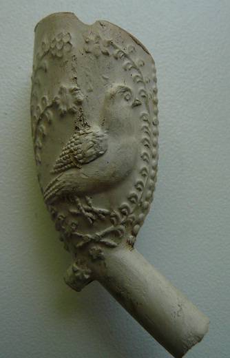 Goudse kleipijpen met de afbeeldingen van een duivin en doffer waren in de 18e eeuw blijkbaar erg gewild bij het rokende publiek want ze worden als bodemvondst vrij veel gevonden. Het succesvol uitbrengen van zo'n kleipijp viel natuurlijk ook de andere Goudse pijpenmakers op die dit type niet in hun assortiment hadden. Aannemelijk is het dat ze dan snel een mal lieten (na)maken die sprekend op de kleipijp leek die zo succesvol was. Misschien lieten ze die mal wel maken bij de dezelfde graveur die de bron van zo'n succesvolle pijp was. Omdat hier onderstaand een flinke serie parelnaadpijpjes met een duivin en doffer wordt afgebeeld kan mooi het verschil in uitvoering worden vergeleken. Wat allereerst aan deze kleipijp opvalt is dat er op vrijwel geen enkel exemplaar initialen van de pijpenmaker voorkomen behalve het exemplaar hieronder afgebeeld.