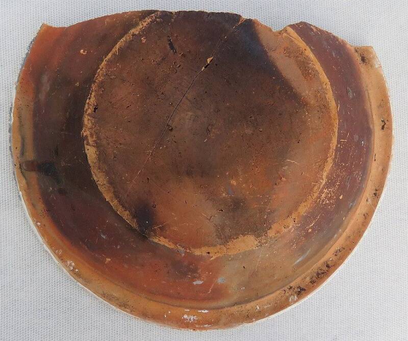 Groot schotelfragment, aardewerk, ringeloorbord, inwendig geglazuurd, decoratie in groen en geel, op standvlak.