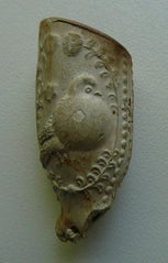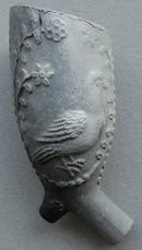 Parelnaadpijpje met links de doffer en rechts de duivin. 1e helft 18e eeuw. Op dit pijpje staat het initiaal van de pijpenmaker met de letters HP. Er komen twee Goudse pijpenmakers in aanmerking als maker n.l. Harmen Boot (1686-1713)