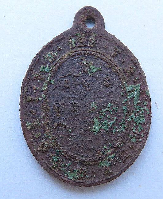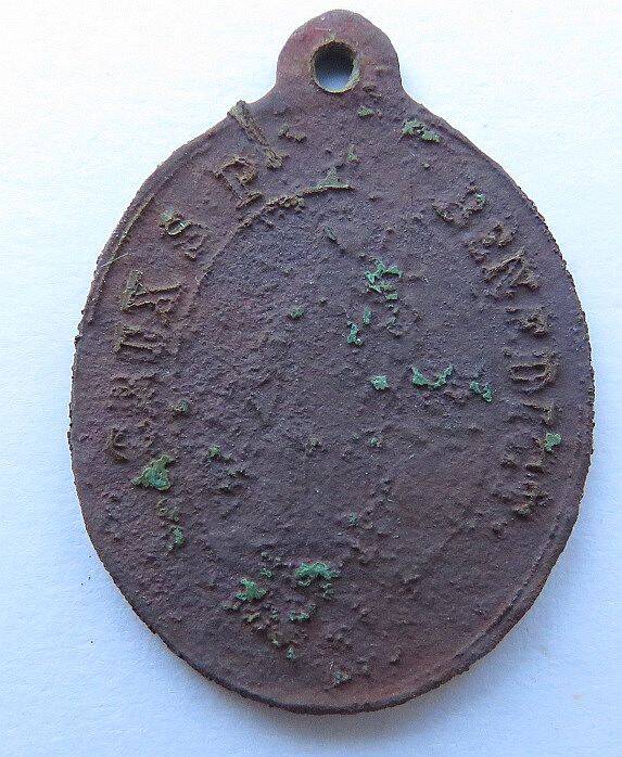 Koperen medaillon/hanger met tekst en afbeelding. Enigszins aangetast. Kerkelijk ter ere van