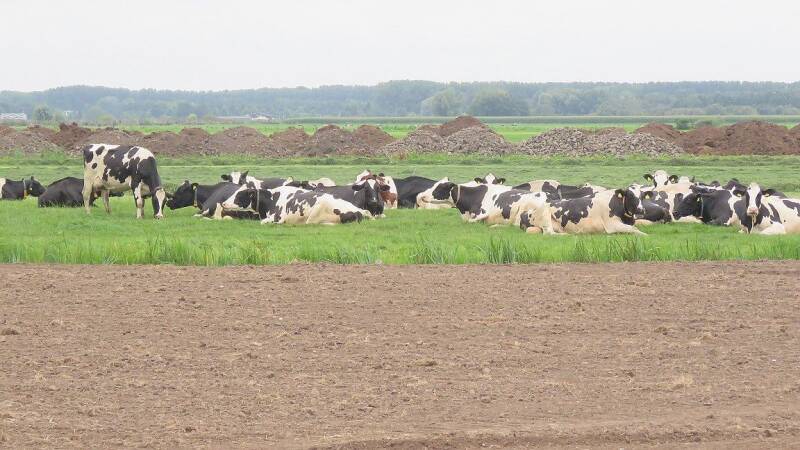 Op de voorgrond de uitgevlakte grond en op de achtergrond koeien en hopen grond nog uit te vlakken.