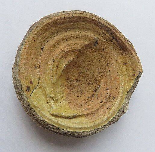 .Bakje van aardewerk. Halfproduct met een duimafdruk en geglazuurd. Diameter 5 cm. 17e/18e eeuw