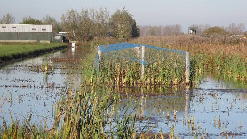 en beschermd tegen ganzenvraat. Doel: versneld moeras ontwikkelen. De andere helft van het perceel blijft plasdras/open water. Foto: 9 november 2025