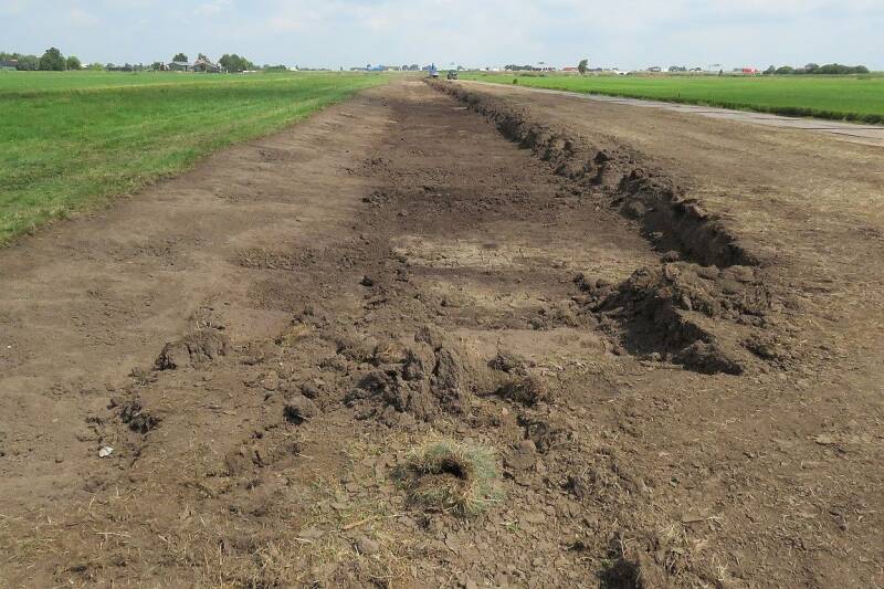 Afgegraven grond op hopen gezet op agrarisch grasland meer in het westen van de polder. Foto: 16 augustus 2025