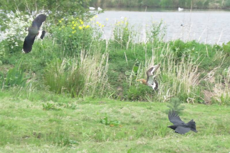 10.15 uur. Grote paniek onder de weidevogels door een marterachtige die in het broedbiotoop liep. Een zwermpje weidevogels er boven zeer paniekerig. 6 grutto's 4 tureluurs, 3 kieviten en 2 scholeksters. Een 40-tal kokmeeuwen uit de kolonie kwam zelfs ook aangevlogen en hing als een wolk boven de plek waar de marterachtige zich moest bevinden.