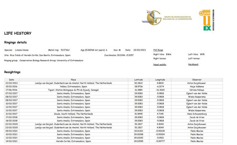 De grutto (volwassen man)  bleek geringd te zijn in 2013 in Spanje (Extremadura).