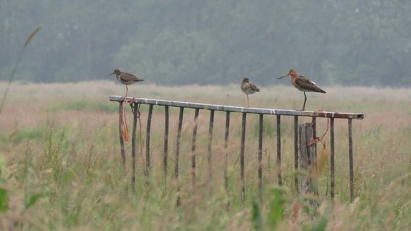 Wakende grutto en tureluur op hek in reservaat Voormalige Bergambachtse Boezem. Foto: 11 juni 2021