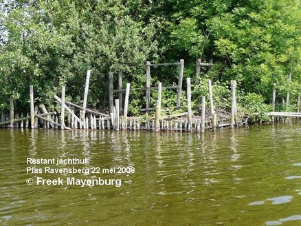 Weinig menselijke activiteiten nog maar op Plas Ravensberg te Reeuwijk. Steeds minder eilandjes, riet en jachthutten. Dat was zo'n 60 jaar geleden nog heel anders. Veel rietkragen, goed onderhouden eilandjes, moerasvogels en veel meer jachthutten. Tegenwoordig moet je om op de plassen waterwildjacht te bedrijven 40 hectare land en water aaneengesloten hebben. Dat was vroeger maar 1 hectare. Reeuwijkers jaagden op hun stukje ter grootte van een of meer hectaren vanuit een jachthut dat op een eilandje stond. Veel van die eilandjes waren overgebleven als restant van de vervening van het Reeuwijkse grasland(moeras)gebied. Men legde soms met veel inspanning zelfs nieuwe eilandjes aan met daarop een jachthut. Jacht was vroeger in Reeuwijk voor veel mensen meer dan een hobby. Er waren zelfs Reeuwijkers die beroepsmatig jager en broodvisser waren. Maar dat ligt inmiddels ver achter ons.