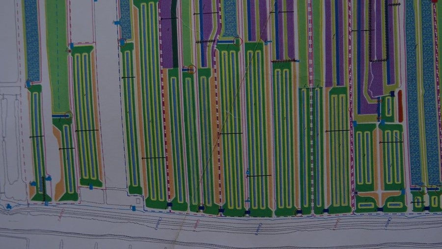 Deel inrichtingskaart met linksonder per perceel waar een nieuwe sloot gegraven zal worden en een deel geplagd.