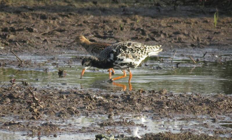 Hier de kemphaanman met naast zich een vrouwtje. Foto: 8 mei 2020. Lang geleden broedden er nog enkele kemphaanpaartjes in de polder Keulevaart nabij de Benschopper Boezem herinner ik me. Maar nu heb ik het over ongeveer 1960. In het polderdeel Hoonaard broedden in die tijd nog forse aantallen weidevogels. Grutto's zelfs in kolonievorm en er was ook een kleine baltsplaats waar kemphaanmannen hun prachtige balts toonden.