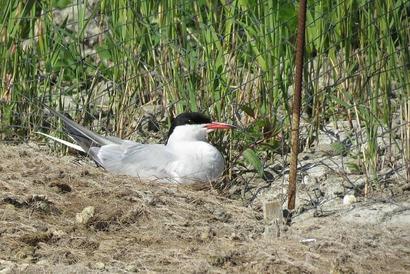 Broedend visdiefje op 30 mei 2020 op een eilandje in plas Elfhoeven. Achter de visdief geplant riet beschermd door gespannen netwerk om vraat door zomerganzen te voorkomen. Wel begreep ik van mensen die hier regelmatig komen dat er al verschillende slachtoffers onder de vogels waren die verward raakten in het gespannen net.