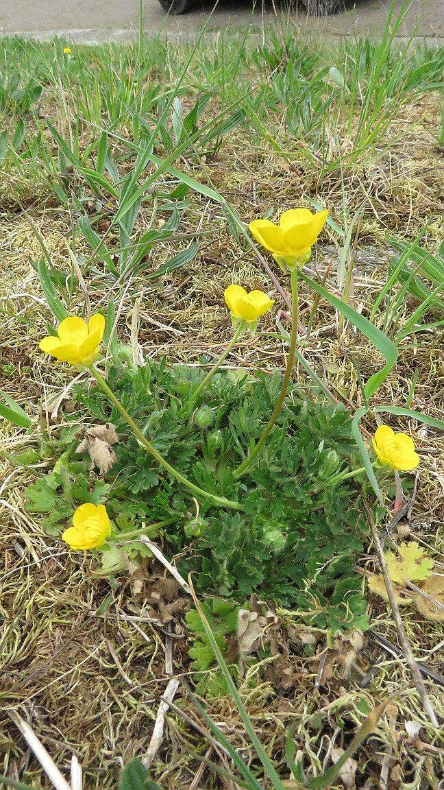 Knolboterbloem op helling zeedijk langs de Westerschelde. Een belangrijk kenmerk zijn de naar beneden omgeslagen kelkblaadjes onder de bloem.