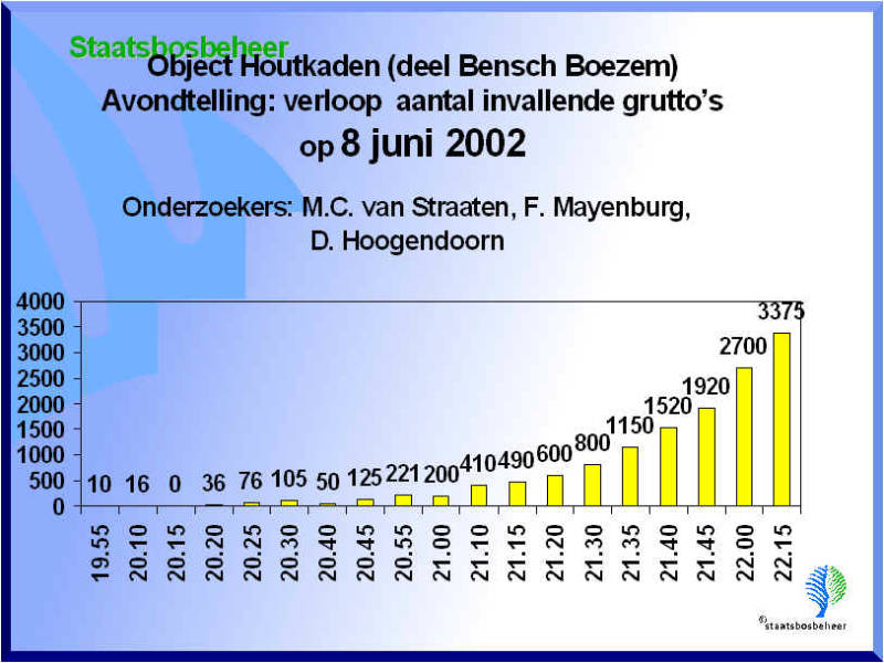 Op 22 maart 2006 een avondtelling uitgevoerd. Om 18.45 uur stonden er 560 grutto's op de plasdrasplaats. Verder ook nog een 15-tal kemphanen, 5 slobeenden en 2 bergeenden op de plasdras. De grutto's verblijven al ruim een week op de plasdrasplaats en de aantallen slapende grutto's zijn alleen maar toegenomen. Er wordt geslapen op de plas en overdag trekken de grutto's de aangrenzende polders in om er te vreten waardoor ze opvetten en zodoende goed in broedconditie komen.