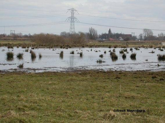 Op een hol gelegen perceel grasland binnen het reservaat staat sinds een half jaar een laagje water met verspreid voorkomende pollen pitrus. De terreincondities zijn blijkbaar zo aantrekkelijk dat flinke aantallen grutto's er nu komen slapen.