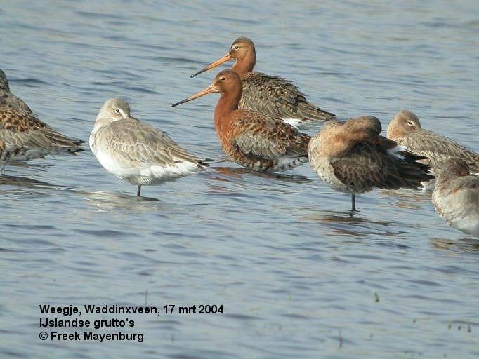 Op 17 maart 2004 zaten op het Weegje bij Waddinxveen vele honderden IJslandse grutto's tussen de Nederlandse grutto's.