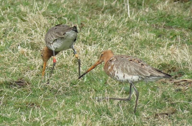 30 maart 2022. Om 15.30 uur 1 gruttopaar (man geringd) druk kuiltje draaiend en ruziënd. Verder 2 losse grutto's verspreid in graslanden.