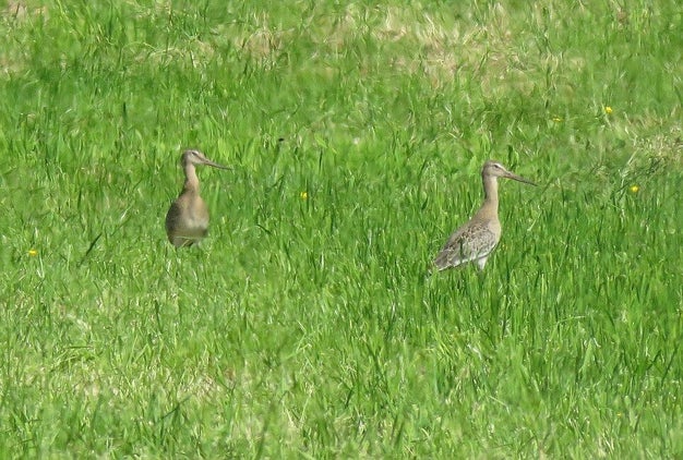 grutto's, tureluurs en soms een gele kwikstaart. Foto: 7 juni 2021. Op deze datum was het grootste deel van de polder nog niet gemaaid.