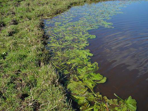 Muskusratten zijn vegetariërs. Hun voedsel bestaat vnl. uit planten waaronder dus ook de bladeren van de gele plomp. Ze gaan nogal slordig om bij het verzamelen van voedsel. Op de foto een baan van bladeren veroorzaakt door de vraat van muskusratten. Hiermee verraden de dieren zich met hun aanwezigheid, een goede indicatie voor de professionele muskusrattenvangers om te weten dat ze hier aanwezig moeten zijn.